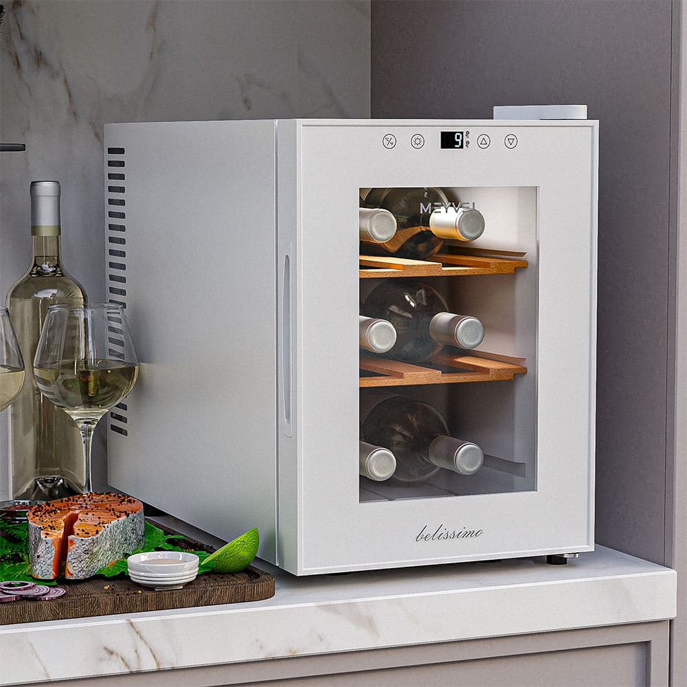 Стеклянная дверца винного шкафа — опция, которая решает сразу несколько задач. Прежде всего, она обеспечивает хороший обзор, позволяет контролировать коллекцию и демонстрировать ее, не открывая дверцу и не нарушая температурный режим. Стекло не только позволяет изолировать вино от наружного воздуха, но и не пропускает посторонние запахи. Прямые солнечные лучи также отрицательно влияют на качество вина, вызывая окисление танина — соединения, которое в нем содержится, и напиток становится горьким. Стеклянные дверцы снабжаются фильтрами или покрытием, защищающим бутылки по ультрафиолета. Способы защиты могут быть самыми разными — от наклеенной пленки до специального напыления. Иногда в дверцу устанавливается зеркальное стекло, в других случаях на него наносят тонировку в технике шелкографии.
