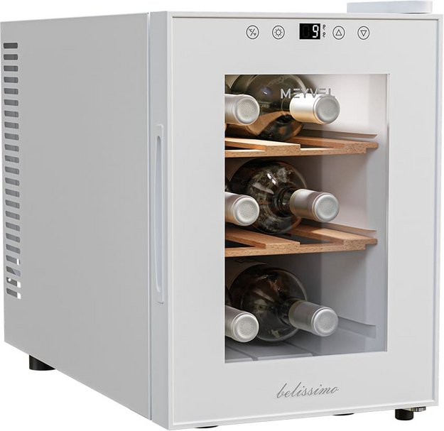 Стеклянная дверь — дополнительный изящный штрих к общему дизайну модели. Специальное покрытие защищает вино от влияния ультрафиолетовых лучей, которые проникают, если шкаф находится в солнечной комнате. Хранение становится еще безопаснее и герметичнее благодаря нескольким слоям стекол. Цвет корпуса — белый.