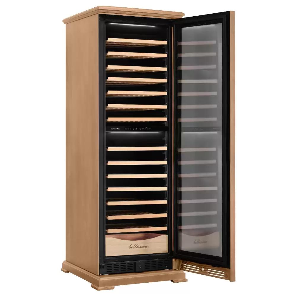 Винный шкаф Meyvel MV163PRO KBT2 Naturalnyy buk сочетает в себе элегантный дизайн и профессиональные функции для хранения и презентации коллекции напитков. Натуральный шпон бука в сочетании со стальной конструкцией создаёт тёплый и солидный образ, который легко впишется в интерьер дома, ресторана или бара. Чёрная накладная ручка и панорамное трёхслойное стекло с тонировкой придают корпусу выставочный характер и защищают содержимое от ультрафиолета.