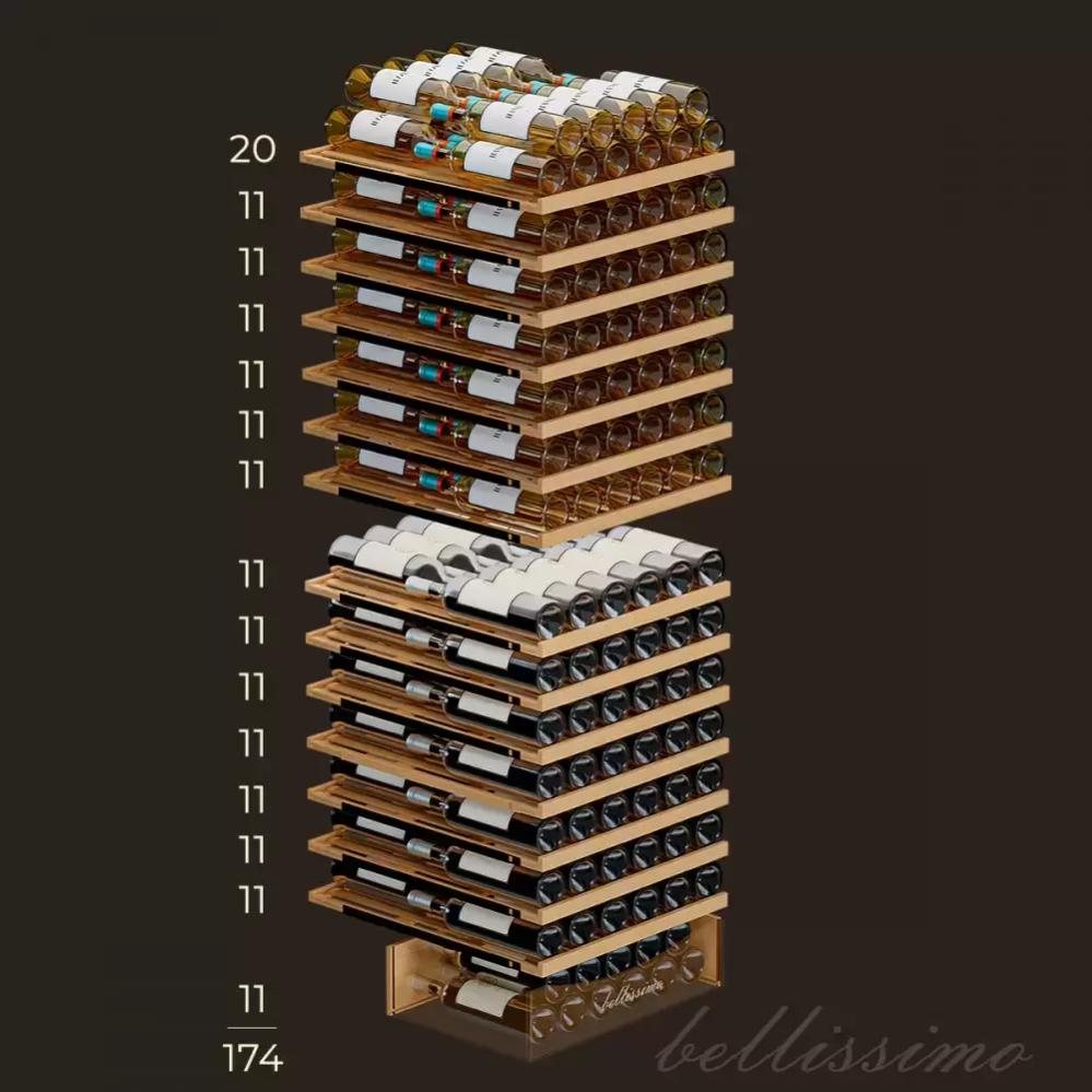 Производители предлагают винные шкафы, оснащенные одной, двумя, тремя и четырьмя камерами, которые могут располагаться как друг под другом, так бок и бок. Самые популярные — однокамерные модели, ассортимент которых особенно широк, но втором месте — двухкамерные. Над заметить, что количество камер не зависит напрямую от габаритов изделия: например, однокамерные модели увеличенных габаритов — далеко не редкость. Их высота может варьироваться в пределах от 14 см до 219 см, а ширина — от 13 см до 150 см.