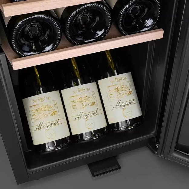 Стеклянная дверь — дополнительный изящный штрих к общему дизайну модели. Специальное покрытие защищает вино от влияния ультрафиолетовых лучей, которые проникают, если шкаф находится в солнечной комнате. Хранение становится еще безопаснее и герметичнее благодаря нескольким слоям стекол. Цвет корпуса — черный.