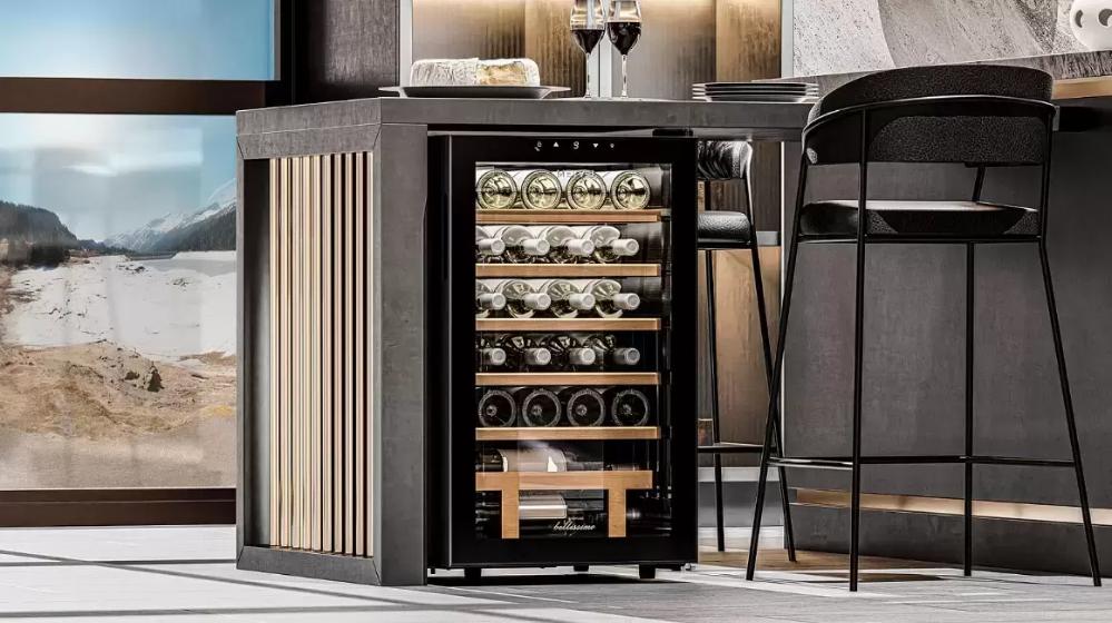 Встраиваемые холодильники для вина оснащаются специальной системой вентиляции: охлаждающая система у них находится в нижней части корпуса спереди. На такие устройства не навешивается мебельный фасад: дверца с затемненным стеклом остается на виду и открывается на достаточно широкий угол для свободного выдвижения деревянных полок.