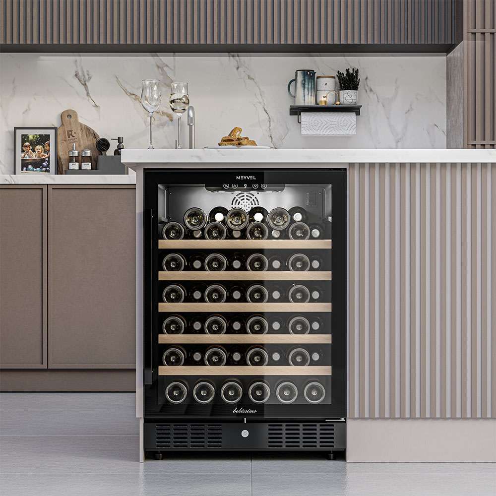 Винный холодильник Meyvel MV52-KBT1 имеет одну температурную зону, в которой можно разместить бутылки и единовременно выставить только одну комбинацию настроек. Он устанавливается отдельно, что удобно, если у вас есть специальное помещение — кладовая, погреб и т.д. Благодаря компактным размерам данная модель — отличный выбор для офиса, гостиничного номера. Количество бутылок, которое можно разместить с учетом полной комплектации и из расчета объема бутылки 0,75 л, — 52 шт.