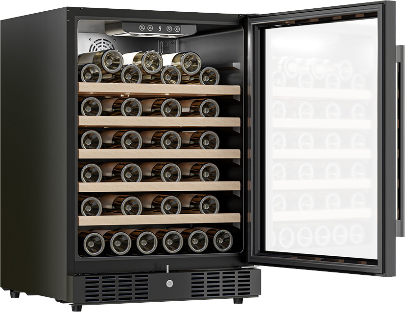 Стеклянная дверь — дополнительный изящный штрих к общему дизайну модели. Специальное покрытие защищает вино от влияния ультрафиолетовых лучей, которые проникают, если шкаф находится в солнечной комнате. Хранение становится еще безопаснее и герметичнее благодаря нескольким слоям стекол. Цвет корпуса — черный. Дверь можно перевесить на другую сторону, поэтому вариантов размещения его в доме становится больше.