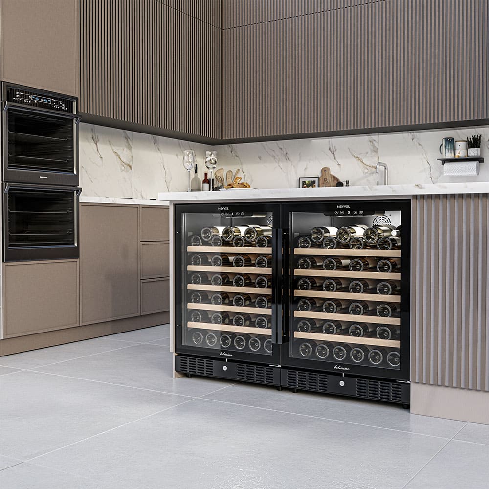 Частичное встраивание отдельно стоящих винных шкафов в нишу — полезная опция, позволяющая сэкономить место в помещении и выбрать лучшее расположение прибора. Устанавливать в нишу или под столешницу рекомендуется только компрессорные модели — другие, например, термоэлектрические, не смогут достаточно вентилироваться при таком расположении. Если винный холодильник оснащен воздухозаборными решетками и радиатором охлаждения в нижней части, он может быть встроен без зазоров. Для удаления нагретого воздуха требуется свободный проход по всей длине холодильника от цоколя до верхней части.