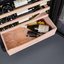Самым подходящим материалом для изготовления полок, по мнению специалистов, является натуральное не лакированное дерево — бук, дуб, сосна, лиственница. У него множество преимуществ: прежде всего оно способно гасить мелкие вибрации. Дерево хорошо поддается обработке: решетчатые полки, например, позволяют хорошо зафиксировать бутылки, так что они не будут качаться при выдвижении. Кроме того, дерево почти не впитывает запахи и при понижении температуры на нем не образуется конденсат. В некоторых моделях применяются комбинированные полки с металлическим каркасом и деревянными держателями бутылок, а также полностью металлические. Недостаток их — образование конденсата, а значит, изменение уровня влажности, которое может привести также к порче этикеток. Самый бюджетный и наименее эффектный вариант — полки из пластика, имеющие те же недостатки, что и металлические.