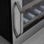 Встраиваемые холодильники для вина оснащаются специальной системой вентиляции: охлаждающая система у них находится в нижней части корпуса спереди. На такие устройства не навешивается мебельный фасад: дверца с затемненным стеклом остается на виду и открывается на достаточно широкий угол для свободного выдвижения деревянных полок.
