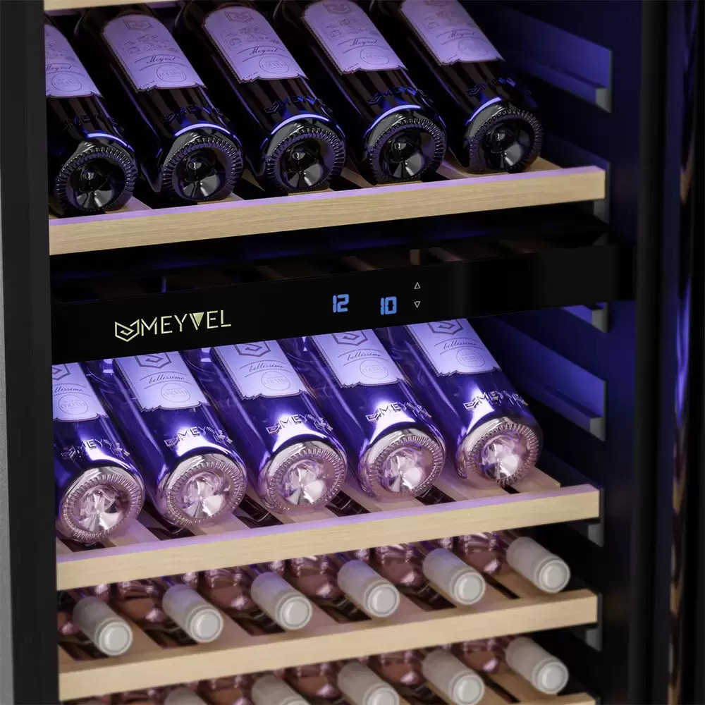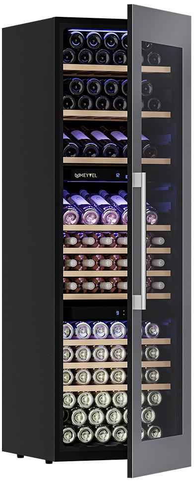 Для длительного сохранения установленных параметров в винных шкафах Meyvel используется дверца с многослойным остеклением. Такое решение позволяет удерживать холод внутри камеры вне зависимости от температуры в помещении, а также сохранить температуру при отключении электроэнергии.