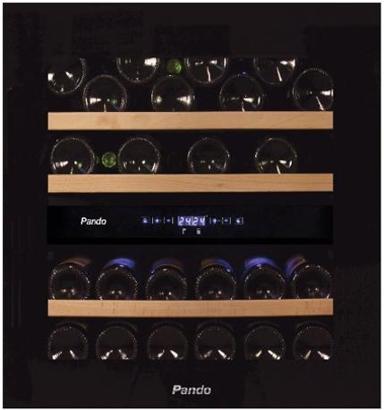 Винный холодильник Pando PVMAVP 60-23CRR W имеет две температурные зоны, в которых одновременно можно хранить разные сорта алкоголя и выставлять разные сочетания настроек. Он встраивается в нишу, что удобно, если у вас ограничен метраж помещения. Благодаря компактным размерам данная модель — отличный выбор для офиса, гостиничного номера. Количество бутылок, которое можно разместить с учетом полной комплектации и из расчета объема бутылки 0,75 л, — 23 шт.