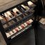 Встраиваемые холодильники для вина оснащаются специальной системой вентиляции: охлаждающая система у них находится в нижней части корпуса спереди. На такие устройства не навешивается мебельный фасад: дверца с затемненным стеклом остается на виду и открывается на достаточно широкий угол для свободного выдвижения деревянных полок.