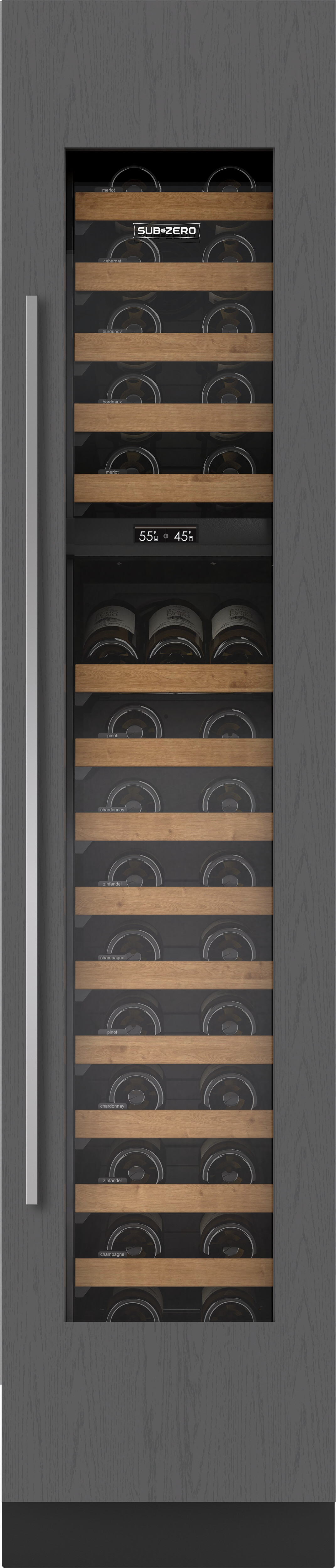 Винный холодильник SUB-ZERO ICBDEC1850W/R имеет две температурные зоны, в которых одновременно можно хранить разные сорта алкоголя и выставлять разные сочетания настроек. Он встраивается в нишу, что удобно, если у вас ограничен метраж помещения. Количество бутылок, которое можно разместить с учетом полной комплектации и из расчета объема бутылки 0,75 л, — 59 шт.