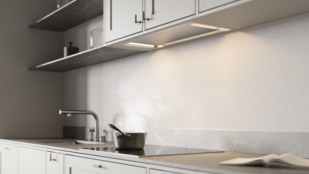 Встраивание вытяжки в шкаф — оптимальный вариант для малогабаритной кухни. Такие модели просты в установке, недороги, практически скрыты от глаз, их не нужно подбирать по внешнему виду, а также чем-то маскировать воздуховод. Уровень шума также снижается благодаря дополнительной звукоизоляции. Встроенные в шкаф модели могут дополняться выдвижной панелью, которая увеличивает площадь забора загрязненного воздуха. Иногда к встраиваемым относят также вытяжки, которые монтируются под подвесной шкаф, хотя их корпус остается на виду.