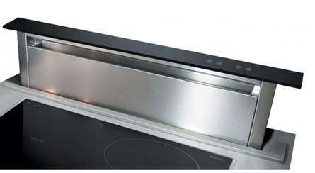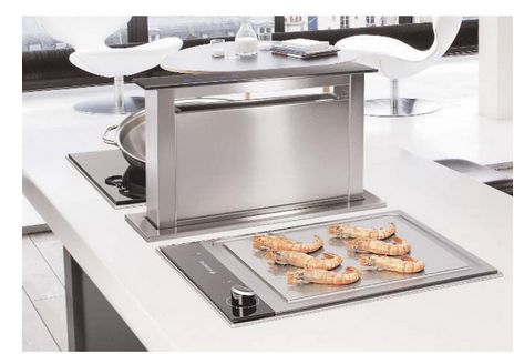 Вытяжки, встраиваемые в столешницу — эффективная инновация, которая подойдет для установки в кухне любой площади. Такие вытяжки размещаются за варочной поверхностью или рядом с ней. В отключенном состоянии всасывающая панель находится под столешницей, но после включения одной или нескольких конфорок она автоматически выдвигается при помощи специального лифтового механизма. Загрязненный воздух улавливается, не успевая распространиться по помещению. Когда вытяжка убрана, на виду остается только сенсорная панель управления. Недостатком подобных моделей является только сравнительно высокая цена.