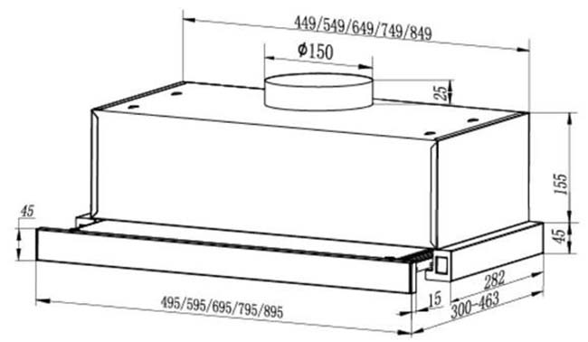У многих встраиваемых моделей глубина может регулироваться, а рабочая всасывающая поверхность — увеличиваться благодаря выдвижному козырьку, но габариты корпуса такой вытяжки должны соответствовать размерам подвесного шкафа. Выбирать основные размеры вытяжки с соблюдением всех требований эффективности и безопасности работы следует также не в ущерб общему дизайну помещения.