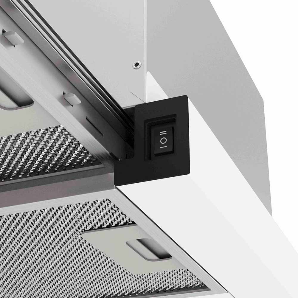 Можно выделить два основных вида вытяжек с выдвижной панелью. В вытяжках, встраиваемых в подвесной шкаф, выдвижная панель необходима, так как размеры таких устройств определяются размерами самого шкафа. В закрытом состоянии глубина вытяжки может быть меньше глубины варочной поверхности. Телескопическая выдвижная панель, которая устанавливается преимущественно в устройствах, работающих в режиме отвода, гарантирует полный захват воздуха, загрязненного каплями жира, частицами сажи, испарениями. Панель можно выдвинуть как нажатием на кнопку, так и потянув за ее переднюю часть. В некоторых моделях при подобном выдвижении одновременно включается подсветка. Когда же панель убрана, вытяжка становится практически незаметной — такой вариант лучше всего подходит для небольшой кухни.