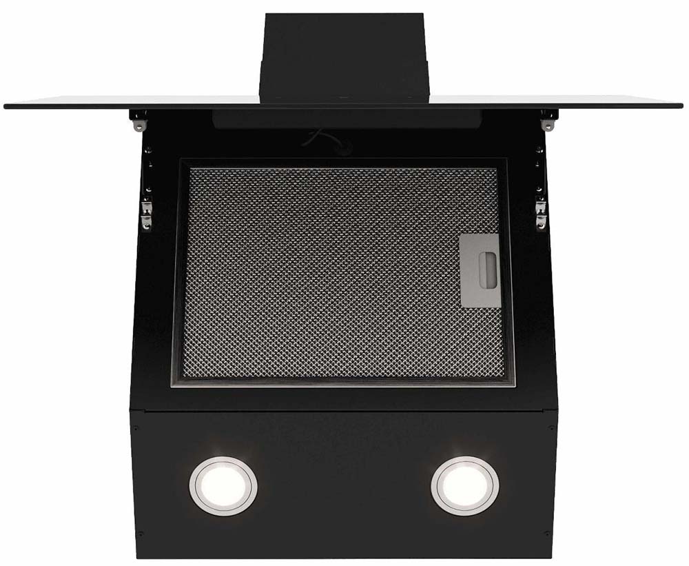 Вытяжки с наклонной фронтальной панелью позволяют освободить пространство над варочной панелью, при этом мощность забора воздуха не страдает от конфигурации модели. Такими вытяжками удобно управлять, так как кнопки обычно находятся спереди, доступ к ним максимально облегчен. Зачастую есть всасывание по периметру.