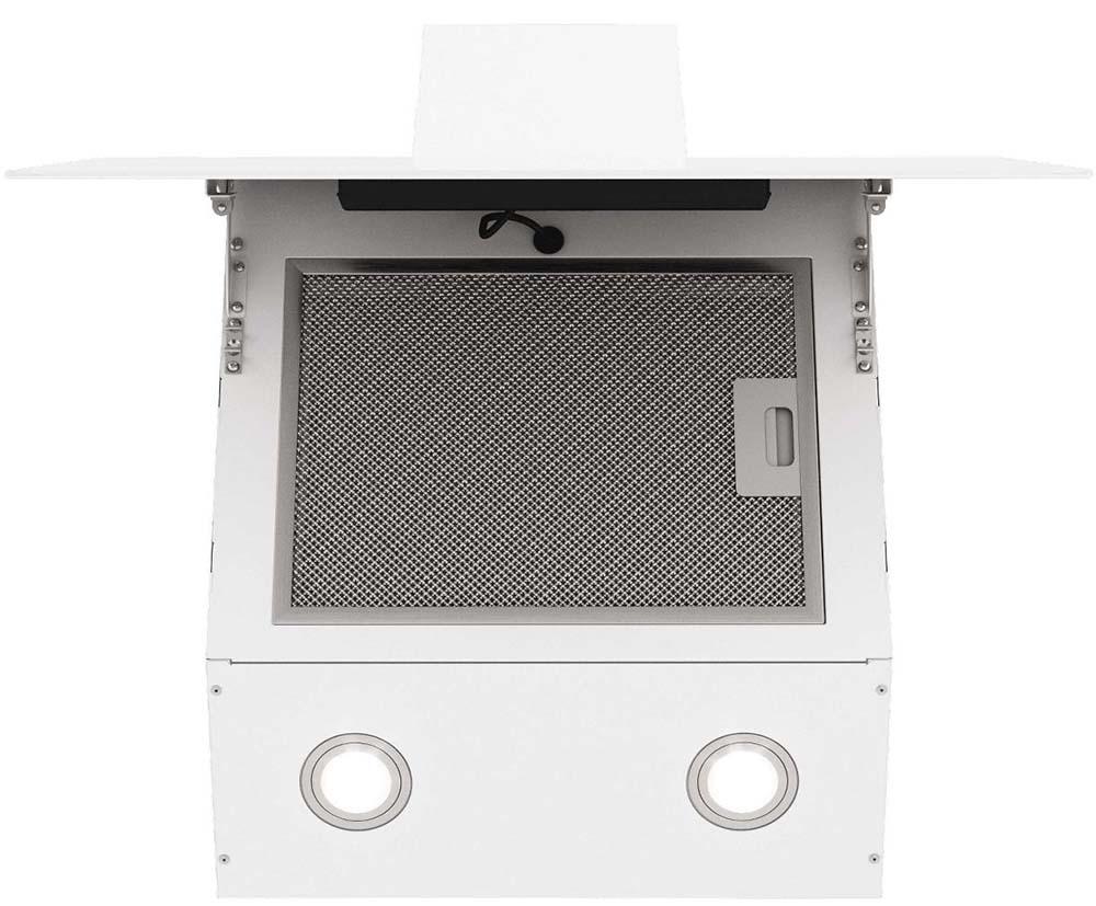 Воздух всасывается по периметру вытяжки через узкие щели. Он собирается в потоки, которые направляются прямо к фильтрам внутри, не рассеивается на кухне. Благодаря этой технологией вытяжку можно сделать компактнее и энергоэффективнее.