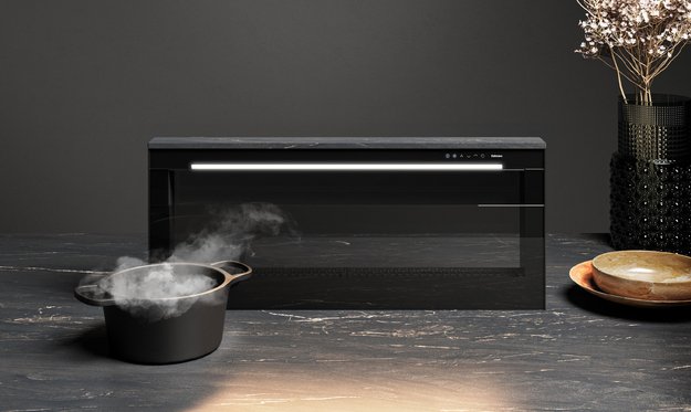 Вытяжки, встраиваемые в столешницу — эффективная инновация, которая подойдет для установки в кухне любой площади. Такие вытяжки размещаются за варочной поверхностью или рядом с ней. В отключенном состоянии всасывающая панель находится под столешницей, но после включения одной или нескольких конфорок она автоматически выдвигается при помощи специального лифтового механизма. Загрязненный воздух улавливается, не успевая распространиться по помещению. Когда вытяжка убрана, на виду остается только сенсорная панель управления. Недостатком подобных моделей является только сравнительно высокая цена.