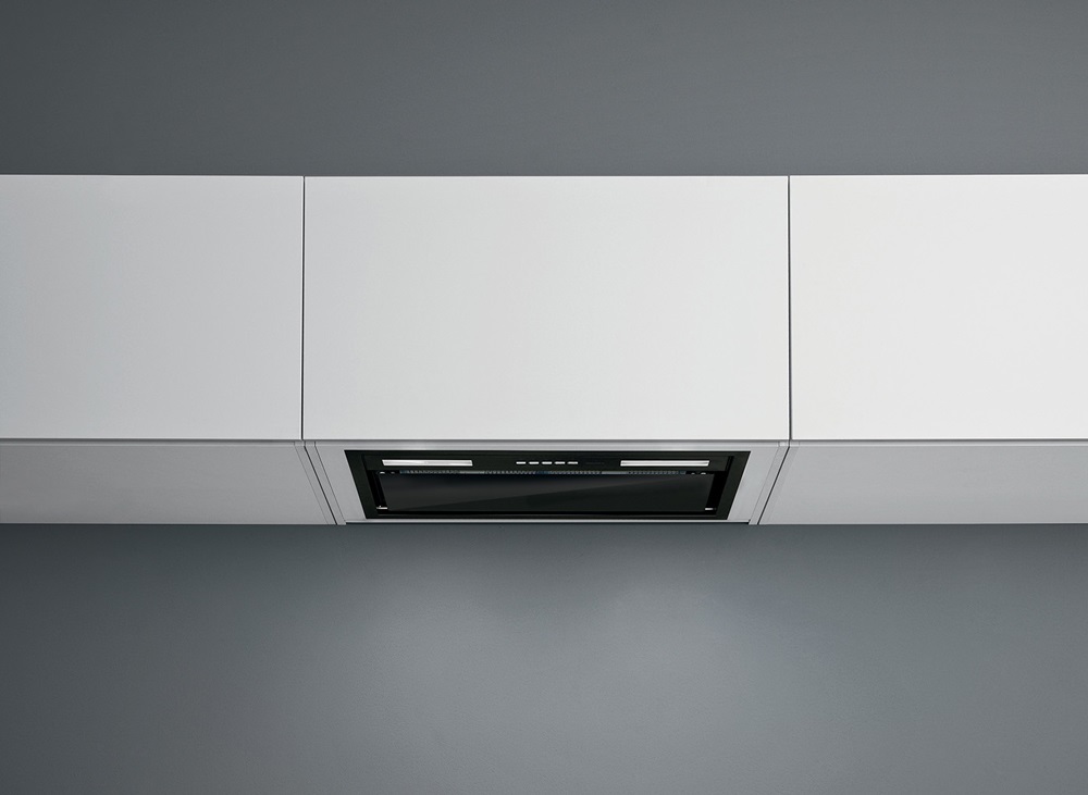 Встраивание вытяжки в шкаф — оптимальный вариант для малогабаритной кухни. Такие модели просты в установке, недороги, практически скрыты от глаз, их не нужно подбирать по внешнему виду, а также чем-то маскировать воздуховод. Уровень шума также снижается благодаря дополнительной звукоизоляции. Встроенные в шкаф модели могут дополняться выдвижной панелью, которая увеличивает площадь забора загрязненного воздуха. Иногда к встраиваемым относят также вытяжки, которые монтируются под подвесной шкаф, хотя их корпус остается на виду.