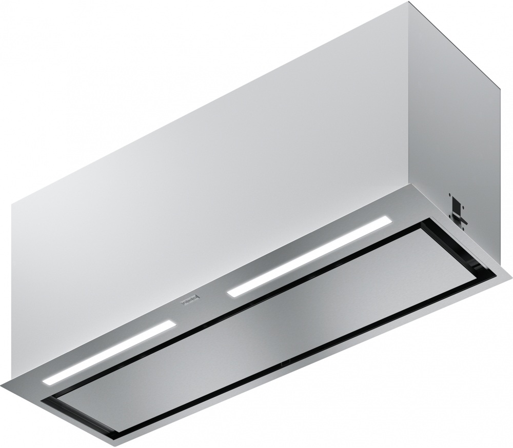Вытяжка, встраиваемая в потолок, часто устанавливается над кухонным островом в просторной кухне и отличается достаточно высокой мощностью: она может работать как в режиме рециркуляции, так и в режиме отвода, так как воздуховод также скрыт в потолке. Вытяжки могут монтироваться в подвесной потолок либо устанавливаться в специальные многоярусные конструкции из гипсокартона непосредственно во время ремонта кухни. Для управления ими используется пульт ДУ.