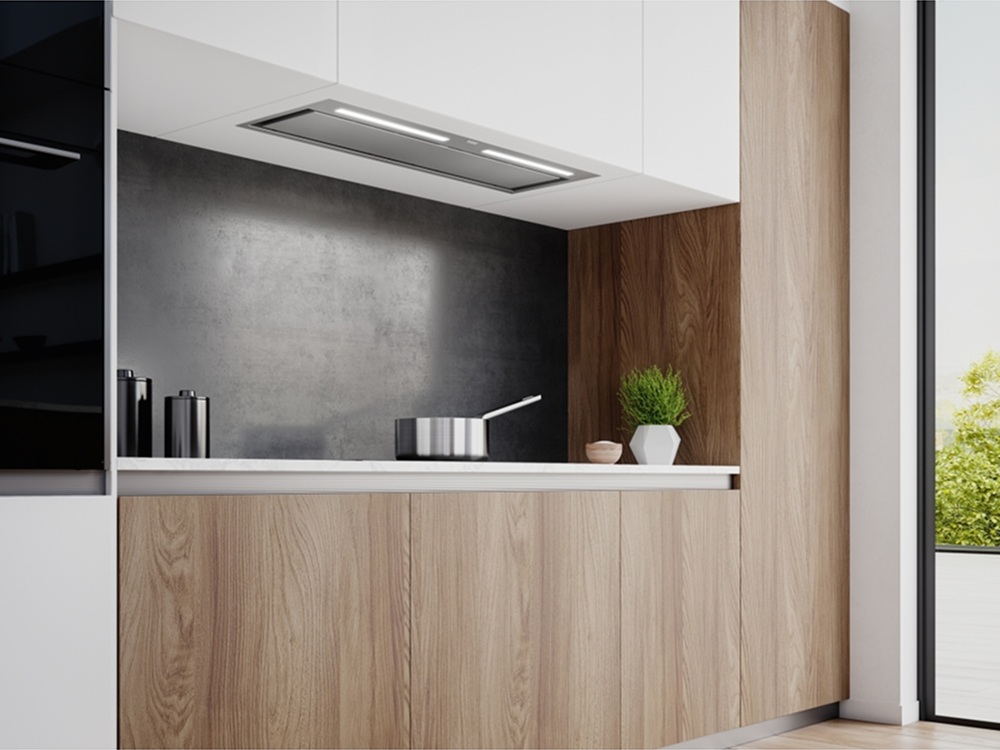Встраивание вытяжки в шкаф — оптимальный вариант для малогабаритной кухни. Такие модели просты в установке, недороги, практически скрыты от глаз, их не нужно подбирать по внешнему виду, а также чем-то маскировать воздуховод. Уровень шума также снижается благодаря дополнительной звукоизоляции. Встроенные в шкаф модели могут дополняться выдвижной панелью, которая увеличивает площадь забора загрязненного воздуха. Иногда к встраиваемым относят также вытяжки, которые монтируются под подвесной шкаф, хотя их корпус остается на виду.