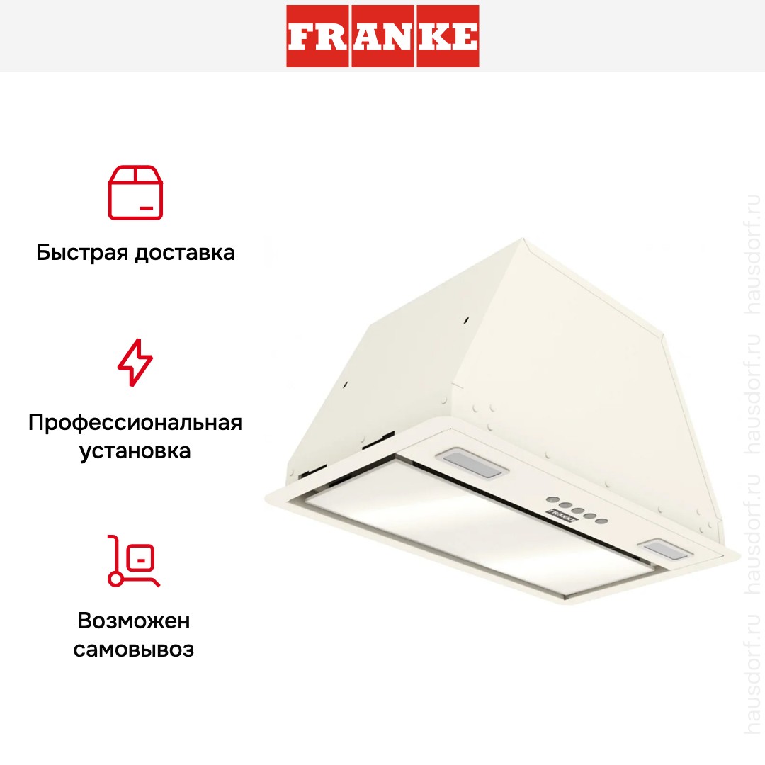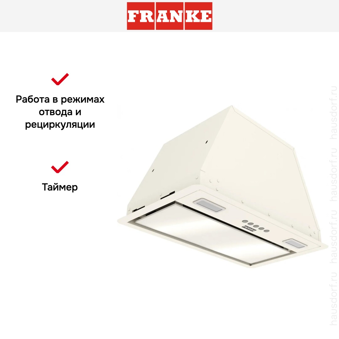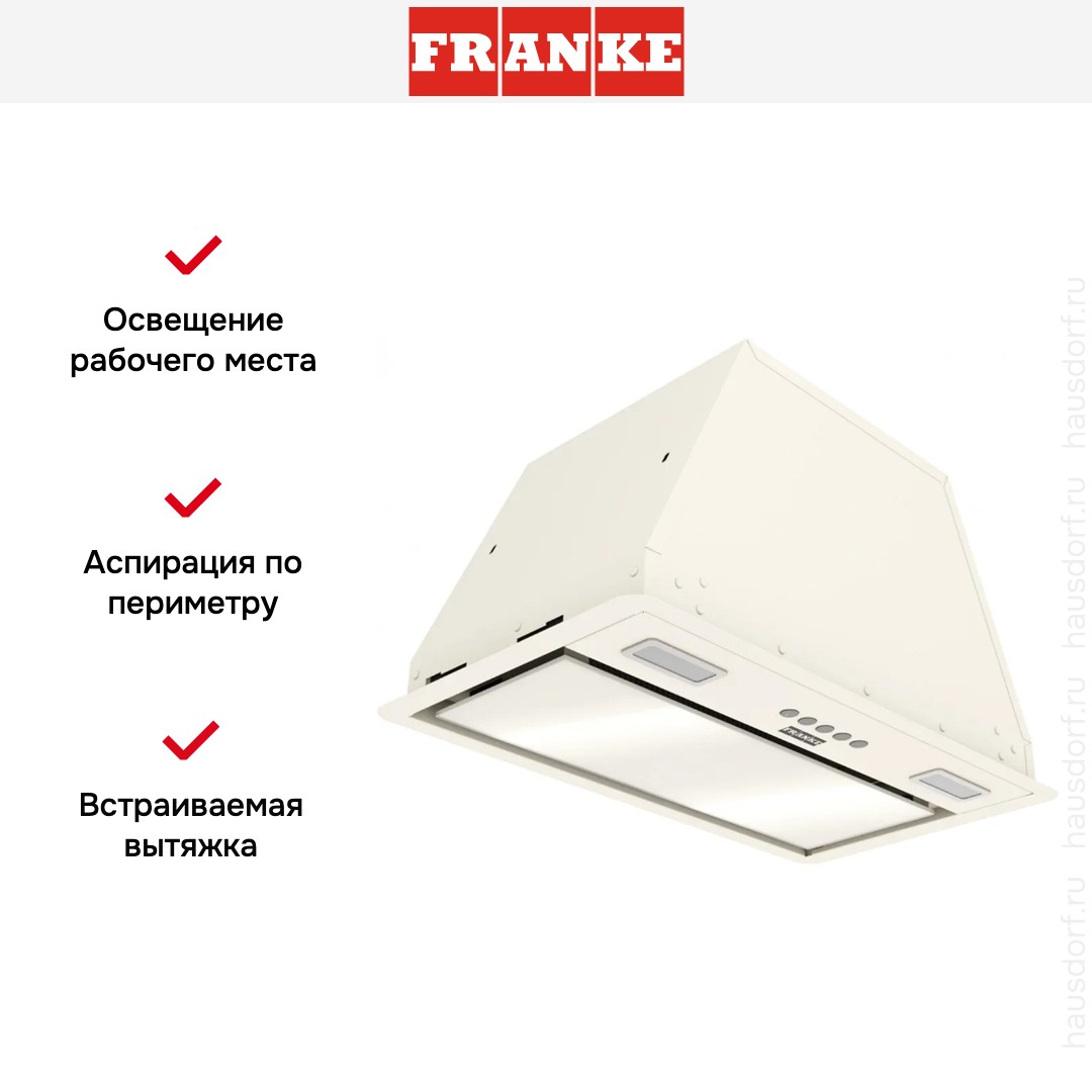 Встраиваемая вытяжка — выбор тех, кто хочет максимально задекорировать технику, или владельцев маленькой кухни. Тип встраивания: в шкаф. Обратите внимание на цветовые сочетания модели Franke VERA 52 BG, чтобы органично вписать ее в свою квартиру. Оттенок корпуса: бежевый. Благодаря лампочкам, которые расположены на нем, можно освещать плиту и столешницу рядом, чтобы готовить было еще проще и приятнее.