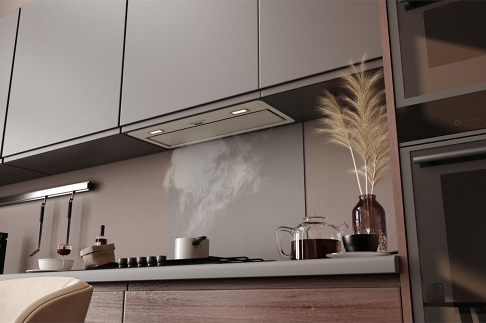 Вытяжка устанавливается в шкаф или в потолочную нишу — таким образом все соединительные элементы и корпус оказываются скрыты. Это подходящий вариант для небольшого помещения, если нужно максимально освободить пространство, а также необходимость, если вы продумываете кухонный дизайн до мелочей.