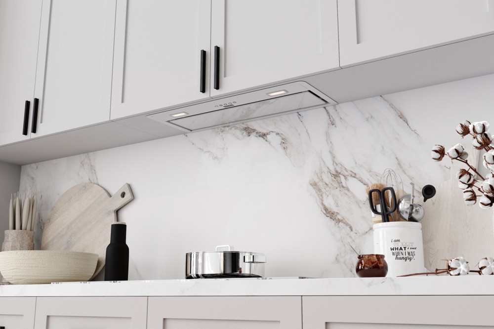 Встраивание вытяжки в шкаф — оптимальный вариант для малогабаритной кухни. Такие модели просты в установке, недороги, практически скрыты от глаз, их не нужно подбирать по внешнему виду, а также чем-то маскировать воздуховод. Уровень шума также снижается благодаря дополнительной звукоизоляции. Встроенные в шкаф модели могут дополняться выдвижной панелью, которая увеличивает площадь забора загрязненного воздуха. Иногда к встраиваемым относят также вытяжки, которые монтируются под подвесной шкаф, хотя их корпус остается на виду.