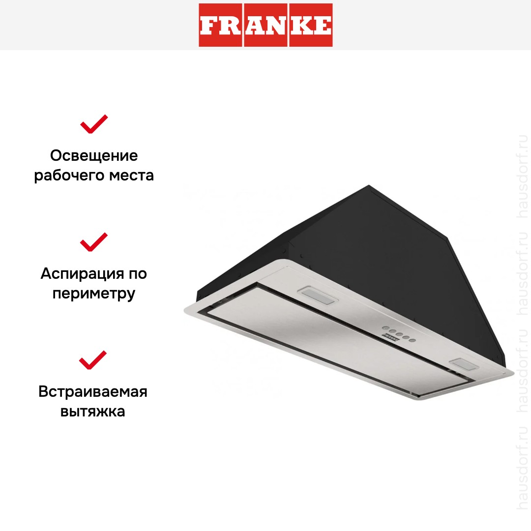 Встраиваемая вытяжка — выбор тех, кто хочет максимально задекорировать технику, или владельцев маленькой кухни. Тип встраивания: в шкаф. Обратите внимание на цветовые сочетания модели Franke VERA 72 SS, чтобы органично вписать ее в свою квартиру. Оттенок корпуса: нержавеющая сталь/черный. Благодаря лампочкам, которые расположены на нем, можно освещать плиту и столешницу рядом, чтобы готовить было еще проще и приятнее.