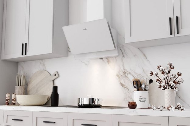 Еще один универсальный цвет — белый, он особенно хорошо подходит для небольших кухонь, так как зрительно способен расширить пространство. На белом фона меньше заметны капли воды и даже частицы жира. В классическом или античном белом выполняются купольные и каминные вытяжки, угловые и встраиваемые модели. Светлые кремовые тона, оттенок слоновой кости — наиболее распространенный вариант для больших вытяжек с окантовкой из натурального дерева.