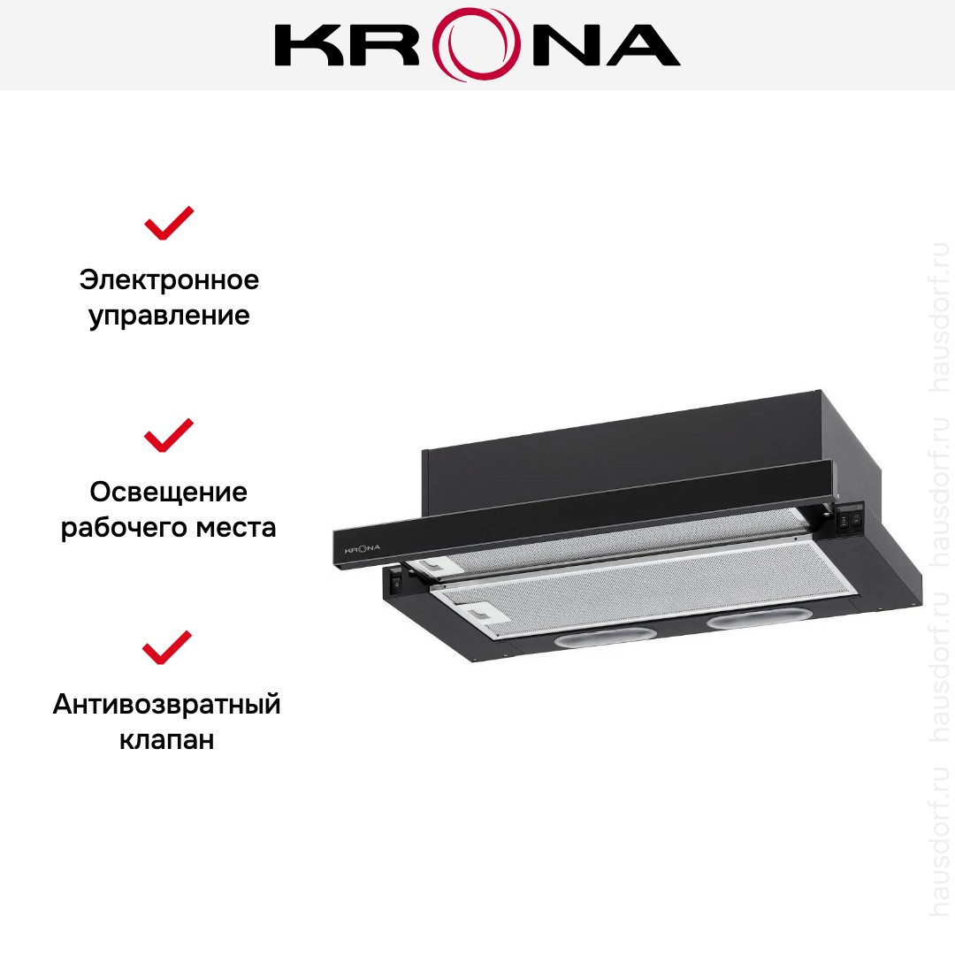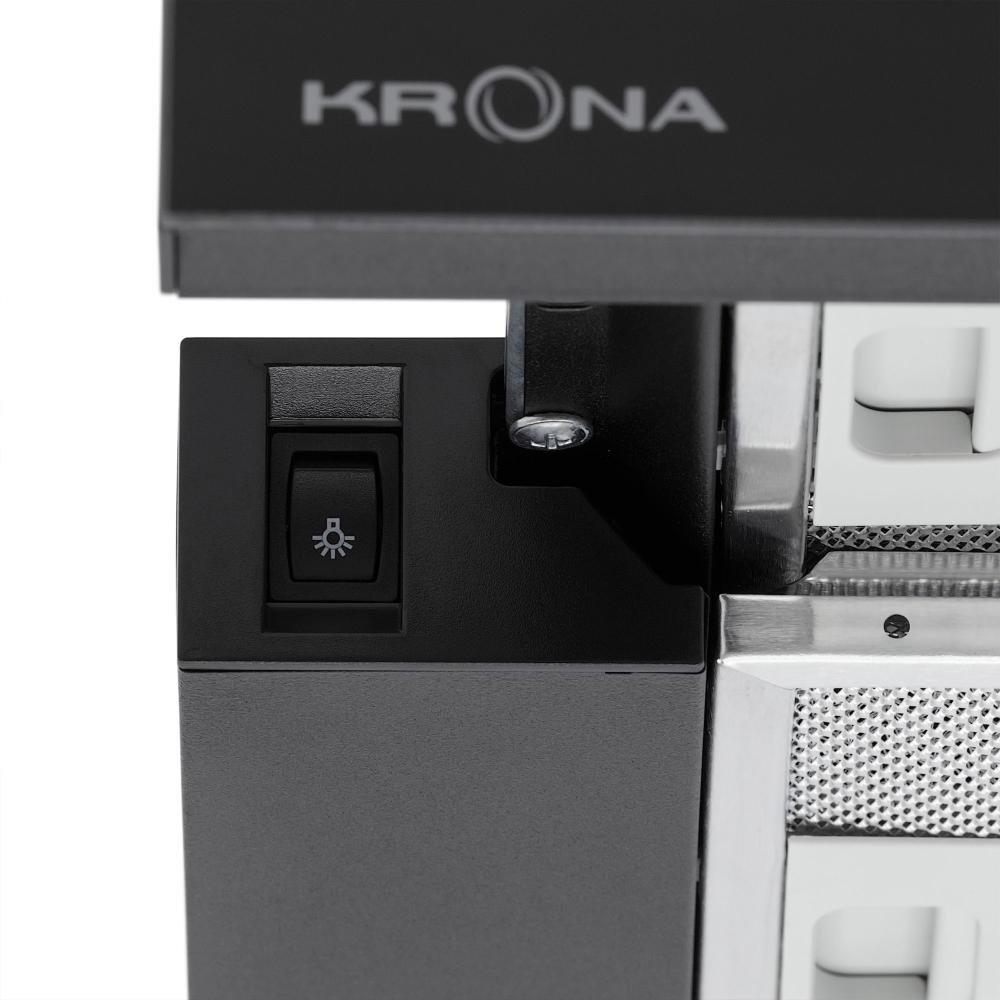 Встраиваемая вытяжка — выбор тех, кто хочет максимально задекорировать технику, или владельцев маленькой кухни. Тип встраивания: в шкаф. Обратите внимание на цветовые сочетания модели KRONA KAMILLA 600 2DN BL GLASS, чтобы органично вписать ее в свою квартиру. Оттенок корпуса: черный. Благодаря лампочкам, которые расположены на нем, можно освещать плиту и столешницу рядом, чтобы готовить было еще проще и приятнее. Фишка этой техники — выдвижная панель.