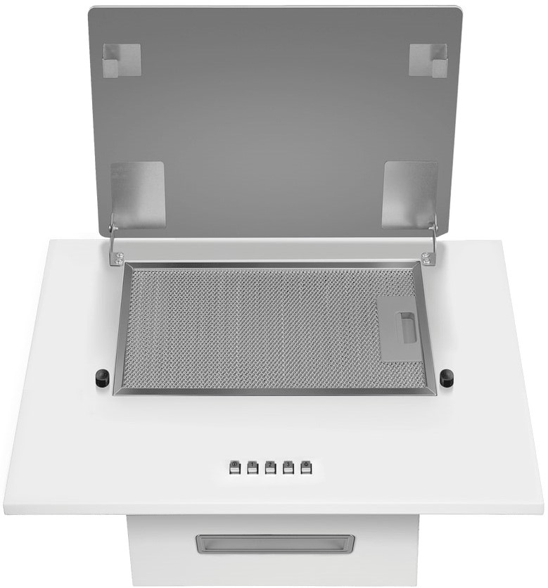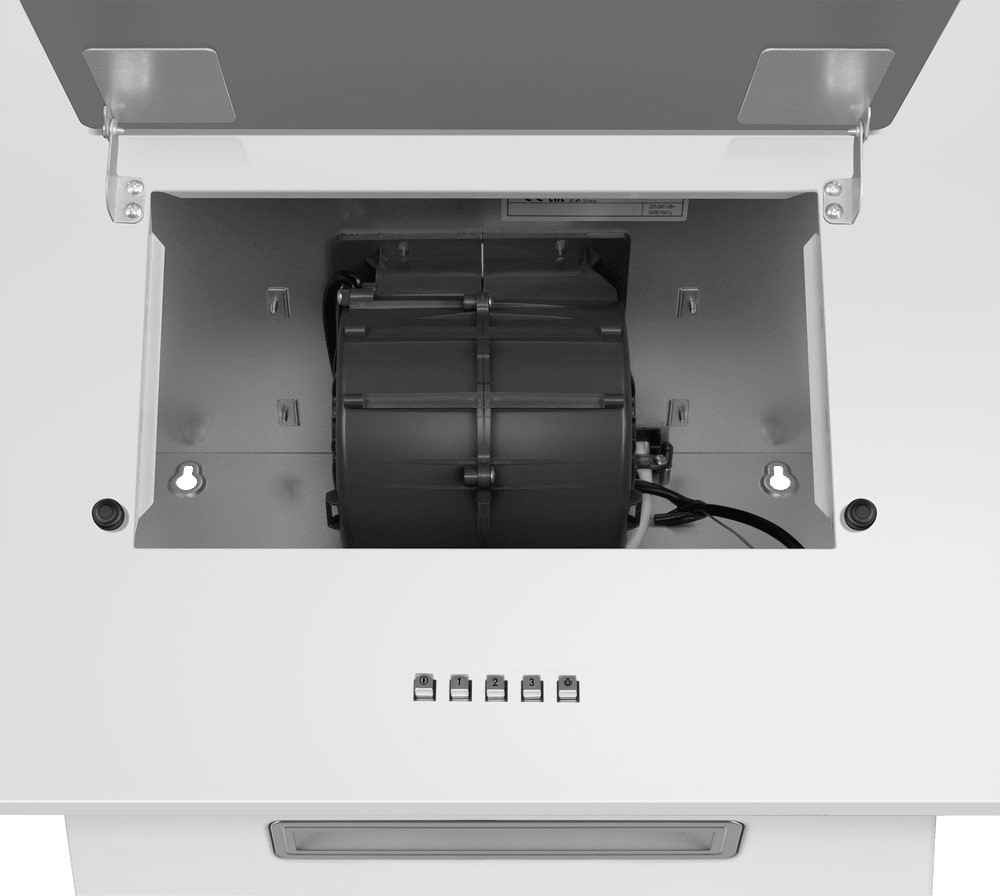 Корпус шириной 60 см подходит под стандартные варочные панели. Глубина 35,5 см и регулируемая высота до 92 см позволяют точно подстроить прибор под кухонный гарнитур. Белый цвет легко комбинируется с разными вариантами отделки, а гладкие поверхности из металла и стекла удобны в уходе и устойчивы к бытовым воздействиям. Освещение рабочей зоны производится светодиодной лампой мощностью 1,5 Вт. Она даёт ровный свет и не тратит много электроэнергии.