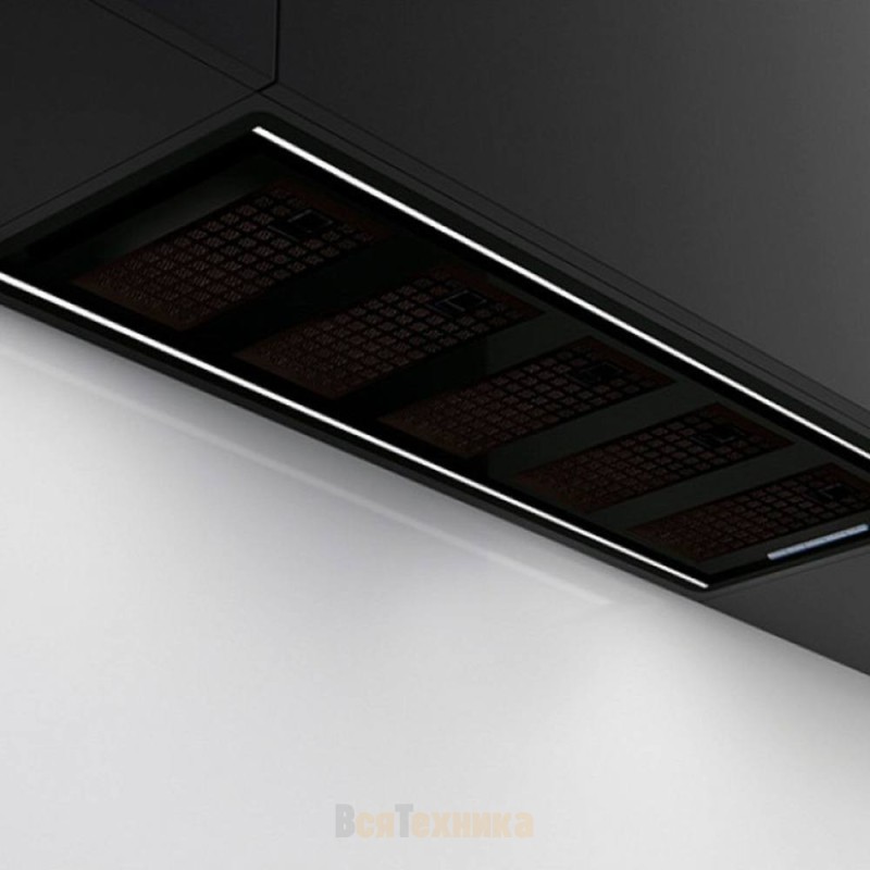 Вытяжка, встраиваемая в потолок, часто устанавливается над кухонным островом в просторной кухне и отличается достаточно высокой мощностью: она может работать как в режиме рециркуляции, так и в режиме отвода, так как воздуховод также скрыт в потолке. Вытяжки могут монтироваться в подвесной потолок либо устанавливаться в специальные многоярусные конструкции из гипсокартона непосредственно во время ремонта кухни. Для управления ими используется пульт ДУ.