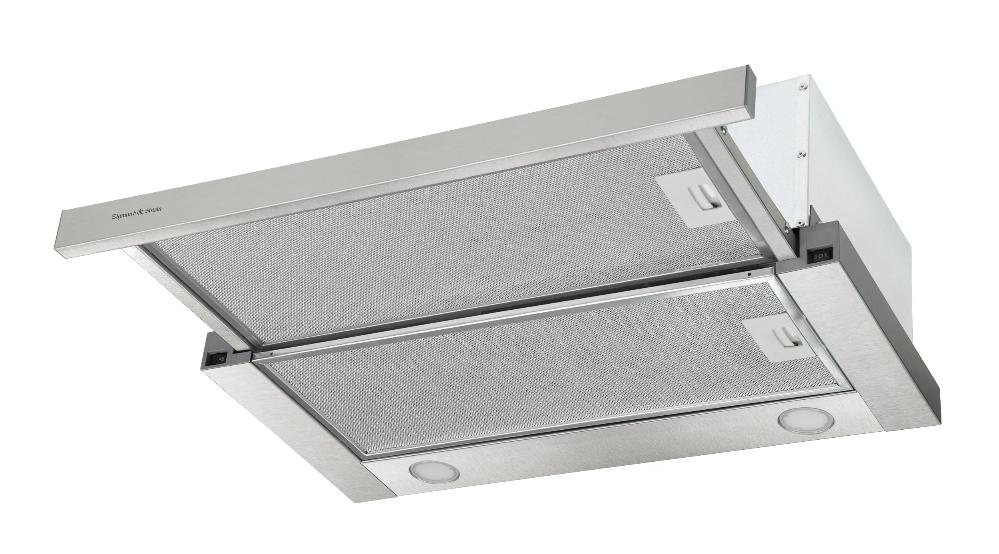 Можно выделить два основных вида вытяжек с выдвижной панелью. В вытяжках, встраиваемых в подвесной шкаф, выдвижная панель необходима, так как размеры таких устройств определяются размерами самого шкафа. В закрытом состоянии глубина вытяжки может быть меньше глубины варочной поверхности. Телескопическая выдвижная панель, которая устанавливается преимущественно в устройствах, работающих в режиме отвода, гарантирует полный захват воздуха, загрязненного каплями жира, частицами сажи, испарениями. Панель можно выдвинуть как нажатием на кнопку, так и потянув за ее переднюю часть. В некоторых моделях при подобном выдвижении одновременно включается подсветка. Когда же панель убрана, вытяжка становится практически незаметной — такой вариант лучше всего подходит для небольшой кухни.