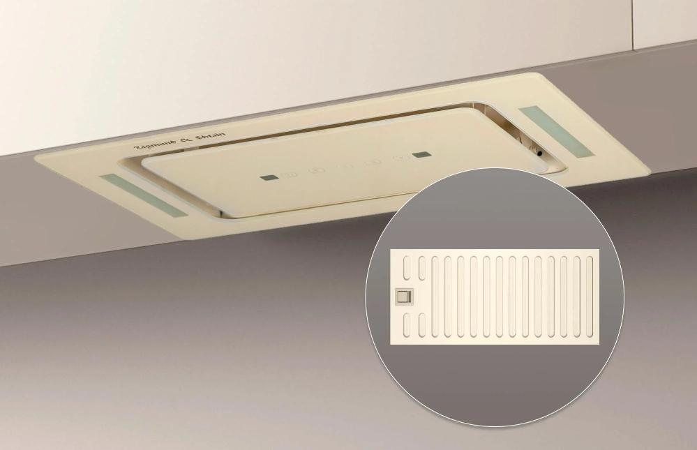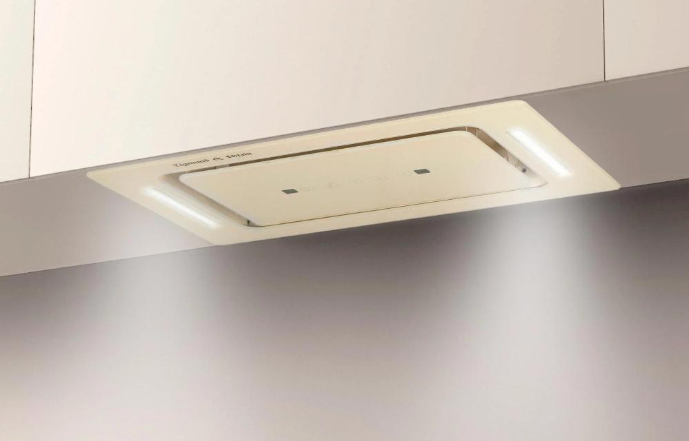 Вытяжка, встраиваемая в потолок, часто устанавливается над кухонным островом в просторной кухне и отличается достаточно высокой мощностью: она может работать как в режиме рециркуляции, так и в режиме отвода, так как воздуховод также скрыт в потолке. Вытяжки могут монтироваться в подвесной потолок либо устанавливаться в специальные многоярусные конструкции из гипсокартона непосредственно во время ремонта кухни. Для управления ими используется пульт ДУ.
