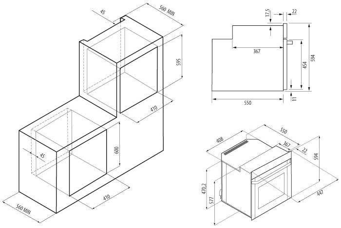 KRONA SONATA 45 WH G2 - схема встраивания с размерами к духовому шкафу на разных языках на Hausdorf