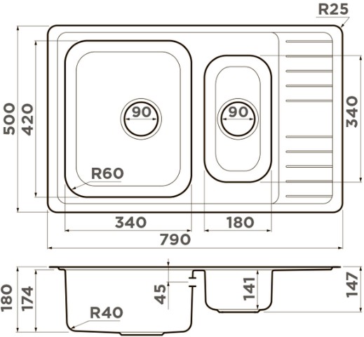 Omoikiri Sagami 79-2 IN - схема с размерами версия 2 к мойке на разных языках на Hausdorf